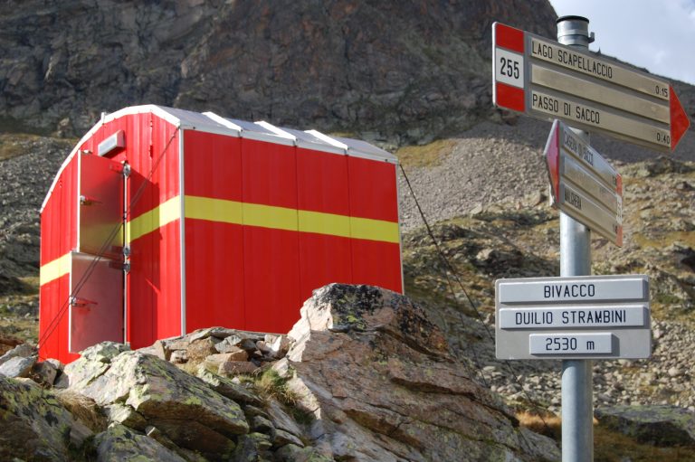 Il Bivacco si trova in Valgrosina occidentale, nei pressi del lago Scapellaccio, lungo il sentiero che da Malghera conduce al passo di Sacco. Ricorda Duilio Strambini, forte e generoso alpinista grosino, guida Alpina, caduto in Grigna il 26 maggio 1978 per la beffa di un fulmine. Dal 1986 ricorda anche Antonio Strambini, caduto tra le Cime di Redasco nel maggio di quell’anno.